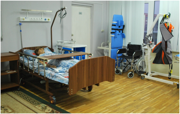 В зоне ухода в домашних условиях на современном тренажере отрабатываются манипуляции по личной гигиене пациента (обработка полости рта, уход за слизистыми носа, ушей, глаз), проводится обучение пациента самостоятельному перемещению по дому, используя трости, костыли, ходунки, роллаторы.