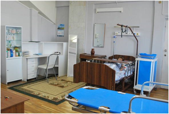 В зоне «Стационар» обучающиеся проводят оценку функционального состояния пациента, отрабатывают оксигенотерапию, дыхательную гимнастику, различные виды эргономичного размещения и перемещения пациента, используют роллаторы, ходунки для самостоятельного перемещения пациентов с ограничениями двигательной способности.