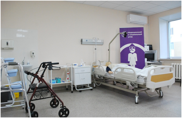 Зона "Хоспис" предназначена для отработки манипуляций по ПМ Выполнение работ по профессии "Младшая медицинская сестра по уходу за больными", оснащена современным медицинским оборудованием.