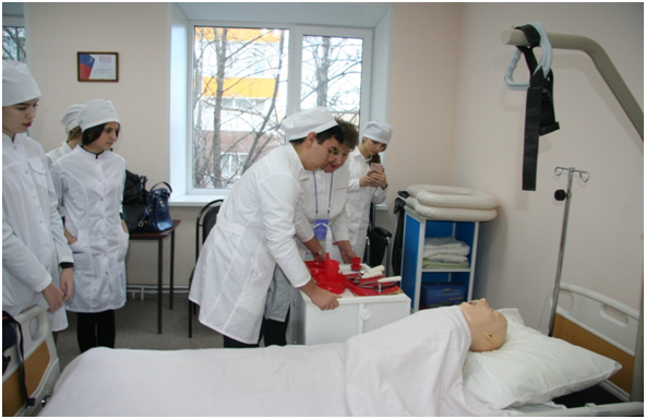 При помощи современных вспомогательных средств ухода обучающиеся осуществляют кормление тяжелобольного пациента, умывание и мытьё головы в постели, оказывают помощь при застёгивании пуговиц и надевании носков.