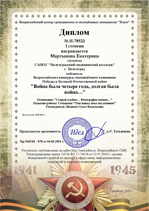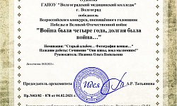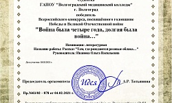 Студентка 2 курса специальности "Акушерское дело" Мартынова Екатерина приняла участие во Всероссийском конкурсе, посвященном годовщине Победы в Великой Отечественной войне "Война была четыре года, долгая была война….". Подготовку студентки осуществлял преподаватель русского языка и литературы Иванова О.В.