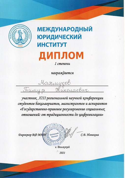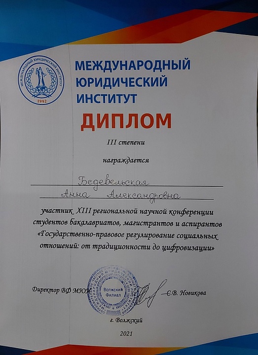 20 мая 2021 года в Волжском филиале Международного юридического института прошла XIII региональная научно-практическая конференция «Государственно-правовое регулирование социальных отношений от традиционности до цифровизации» для студентов, магистрантов и аспирантов. В рамках конференции работали три секции – «Теоретико-правовые аспекты регулирования социальных отношений», «Современные проблемы борьбы с преступностью» и «Актуальные проблемы гражданского права».