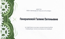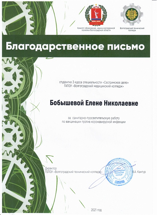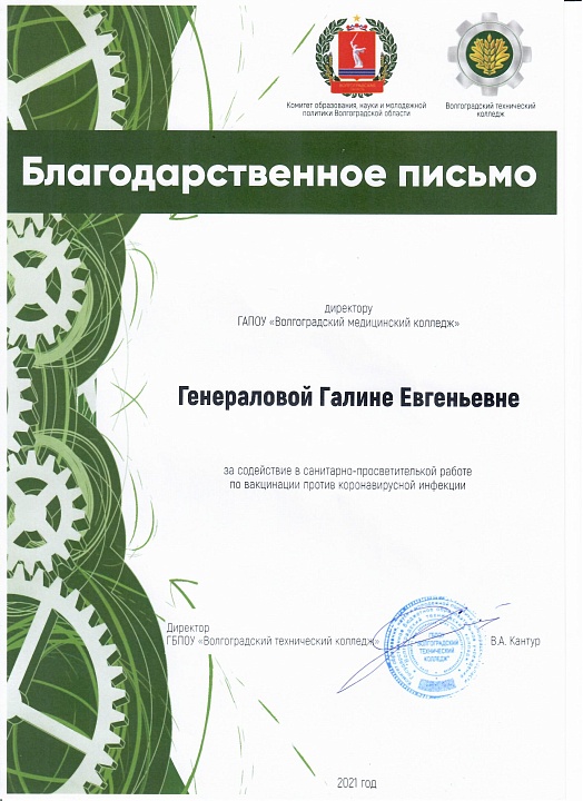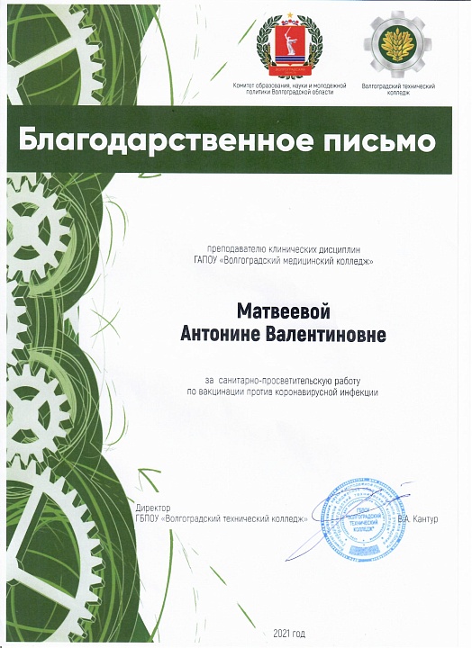 Около 300 студентов этого учебного заведения получили информацию о важности прививки от COVID – 19. Работа наших волонтеров была отмечена благодарностями администрации ГБПОУ «Волгоградский технический колледж».