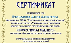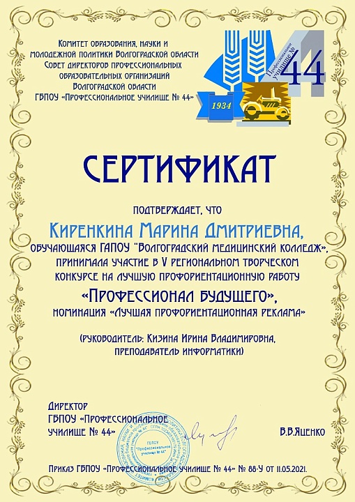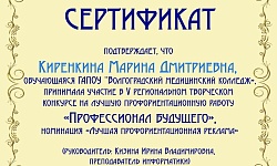 Сертификатом участника отмечена Киренкина Марина студентка группы М-922 в номинации «Лучшая профориентационная реклама» - представление творческих презентаций, видеороликов, отражающих сущность выбранной профессии, специальности, требования к ней, личные качества профессионала и т.д.