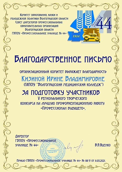 В мае 2021 года подведены итоги, проходившего с 22 марта по 23 апреля 2021 года V регионального творческого конкурса на лучшую профориентационную работу «Профессионал будущего». Цель конкурса - создание условий для личностно-профессионального самоопределения и развития обучающихся.