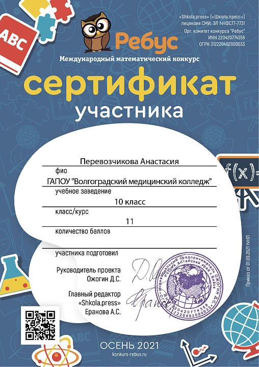Студенты ГАПОУ "Волгоградский медицинский колледж", обучающиеся по специальности "Сестринское дело" на базе основного общего образования приняли участие в Международном математическом конкурсе "Ребус" (научный руководитель – Баева О.А.).