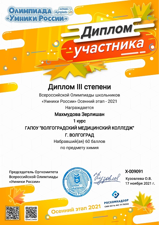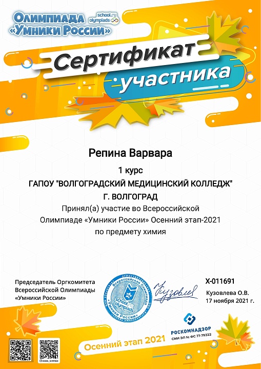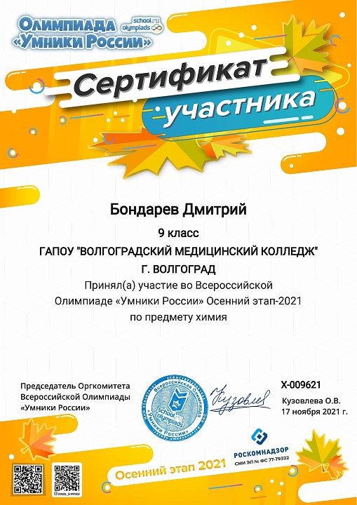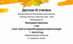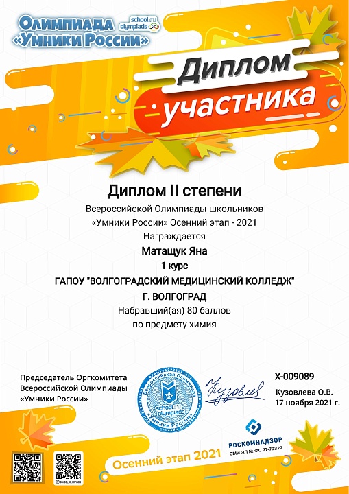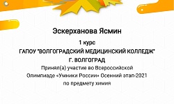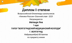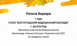 Студенты ГАПОУ "Волгоградский медицинский колледж", обучающиеся на базе основного общего образования приняли участие во Всероссийской олимпиаде школьников "Умники России" Осенний этап – 2021 по предмету химия (научный руководитель – Тимощенко Л.Ю.).