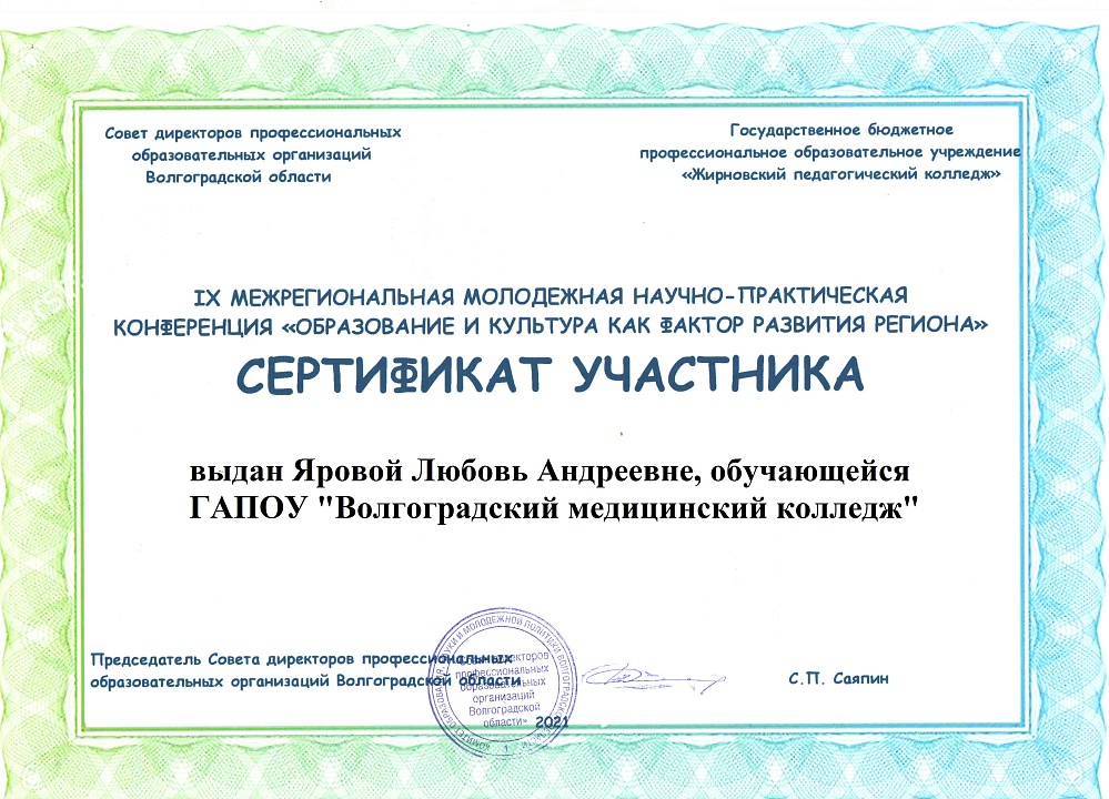 22 ноября 2021 года на базе ГБПОУ «Жирновский педагогический колледж» в заочном формате состоялась IХ Межрегиональная молодежная научно-практическая конференция «Образование и культура как фактор развития региона».
