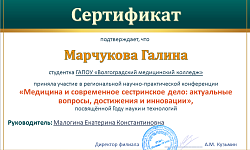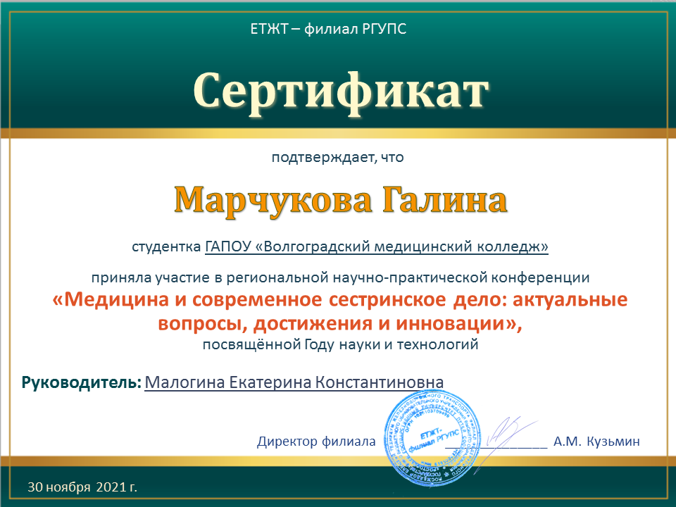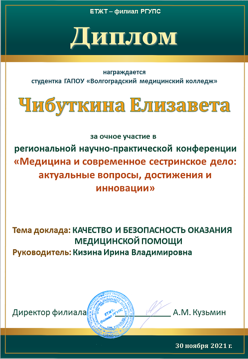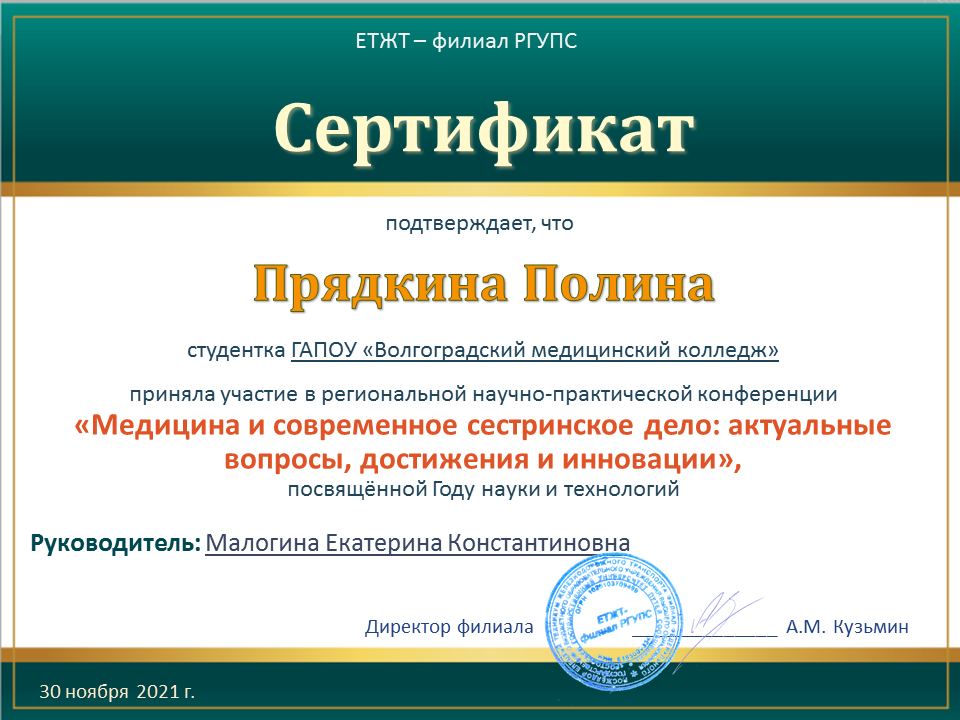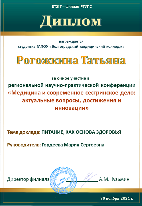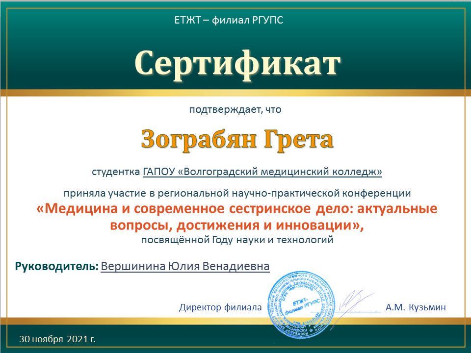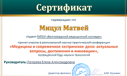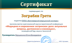 ГАПОУ "Волгоградский медицинский колледж" представляли студенты специальностей Лабораторная диагностика - Загоровская Анастасия (научный руководитель – Крайнова С.В.), Мицул Матвей (научный руководитель – Лагерева Е.А.), Акушерское дело - Зограбян Грета (научный руководитель – Вершинина Ю.В.), Сестринское дело – Прядкина Полина, Марчукова Галина (научный руководитель – Малогина Е.В.), Чибуткина Елизавета (научный руководитель – Кизина И.В.), Рогожкина Татьяна (научный руководитель – Гордеева М.С.).