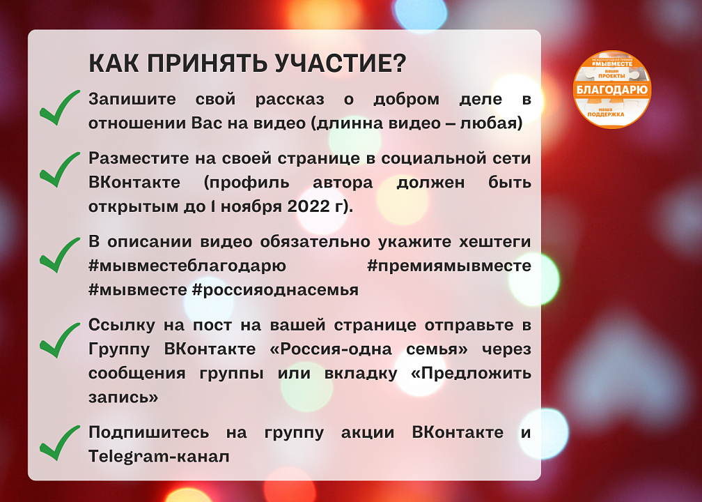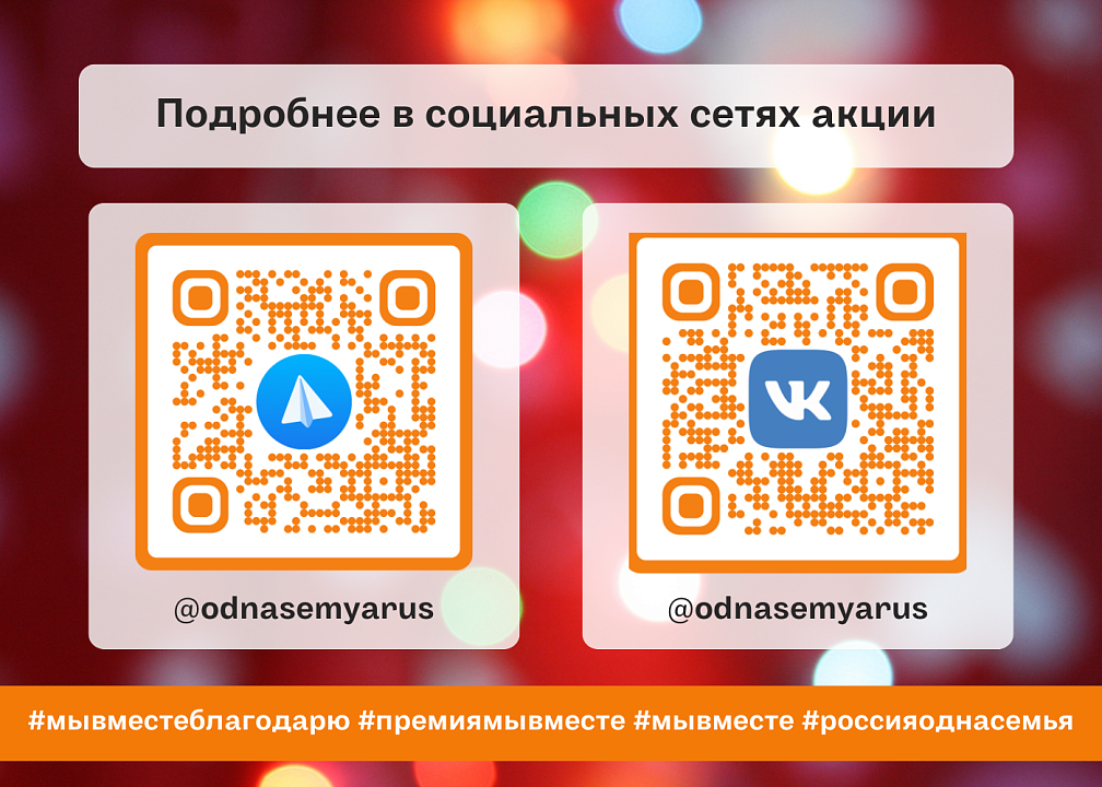 · Подпишитесь на группу акции ВКонтакте (https://vk.com/odnasemyarus) и Telegram-канал (https://t.me/odnasemyarus).