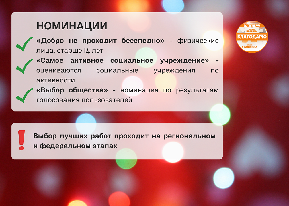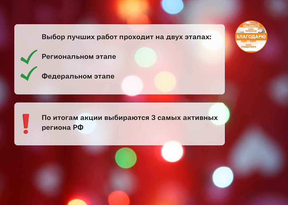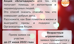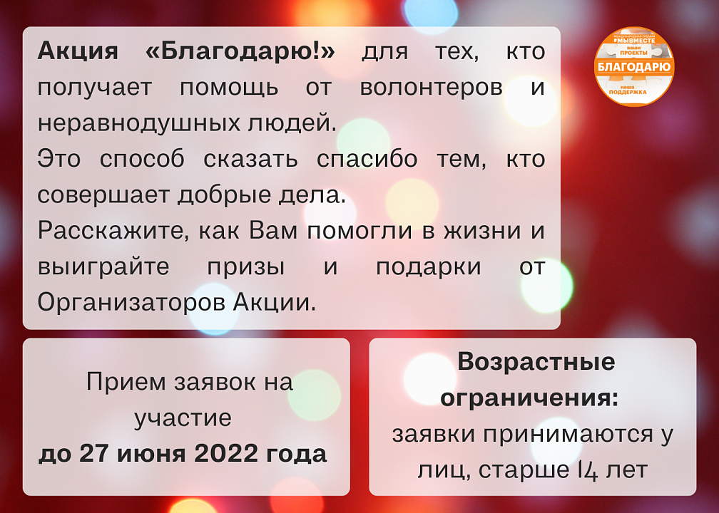 Акция «Благодарю!» для тех, кто получает помощь от волонтеров и неравнодушных людей. Это способ сказать спасибо тем, кто совершает добрые дела. Расскажите, как Вам помогли в жизни и выиграйте призы и подарки от Организаторов Акции.
