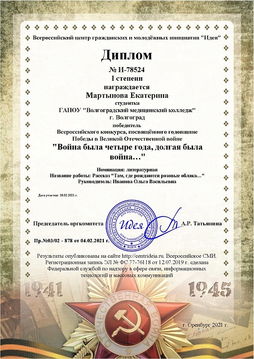 Студентка 2 курса специальности "Акушерское дело" Мартынова Екатерина приняла участие во Всероссийском конкурсе, посвященном годовщине Победы в Великой Отечественной войне "Война была четыре года, долгая была война….". Подготовку студентки осуществлял преподаватель русского языка и литературы Иванова О.В.