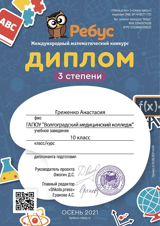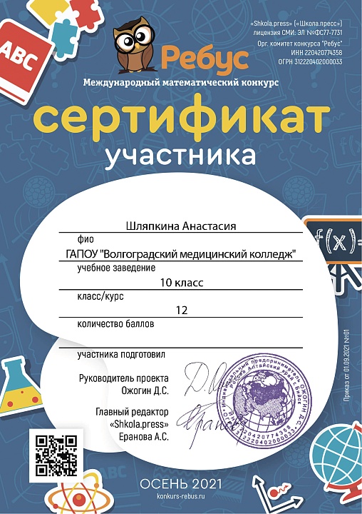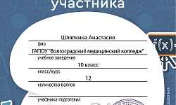 Студенты ГАПОУ "Волгоградский медицинский колледж", обучающиеся по специальности "Сестринское дело" на базе основного общего образования приняли участие в Международном математическом конкурсе "Ребус" (научный руководитель – Баева О.А.).
