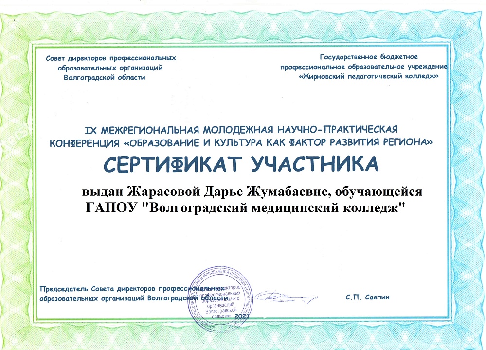 22 ноября 2021 года на базе ГБПОУ «Жирновский педагогический колледж» в заочном формате состоялась IХ Межрегиональная молодежная научно-практическая конференция «Образование и культура как фактор развития региона».