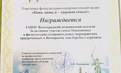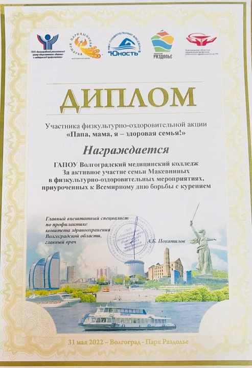 31 мая на площадке поймы реки Царица состоялась масштабная акция «Папа, мама, я – здоровая семья». Мероприятие, посвященное Всемирному дню без табака, объединило сотни сторонников здорового образа жизни и отказа курения. От Волгоградского медицинского колледжа участие в соревнованиях приняла семья сотрудника Макевниной М.Н. Студенты и волонтеры нашего колледжа активно болели за нашу команду! По итогам